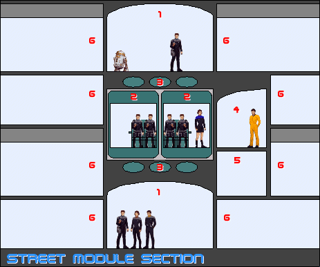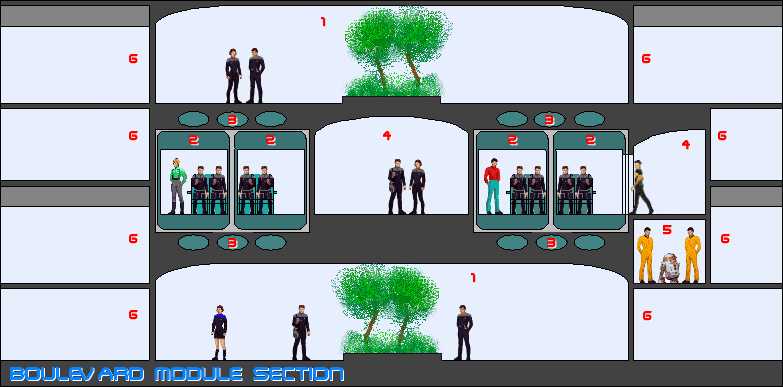 Modules in residential and commercial precincts are broken down into 4 decks, with interconnecting streets and tramways. Streets are wide pedestrian corridors, often decorated to give the illusion of an open street on a planetary surface, complete with planters and holographic "skies." Approximately 10% of these streets are wider boulevards lined with shops and other commercial establishments. The tramways are part of a transit system which services the entire station. Each tram car seats 10 passengers, and is controlled by an AI coordinated by the central transit system computer.